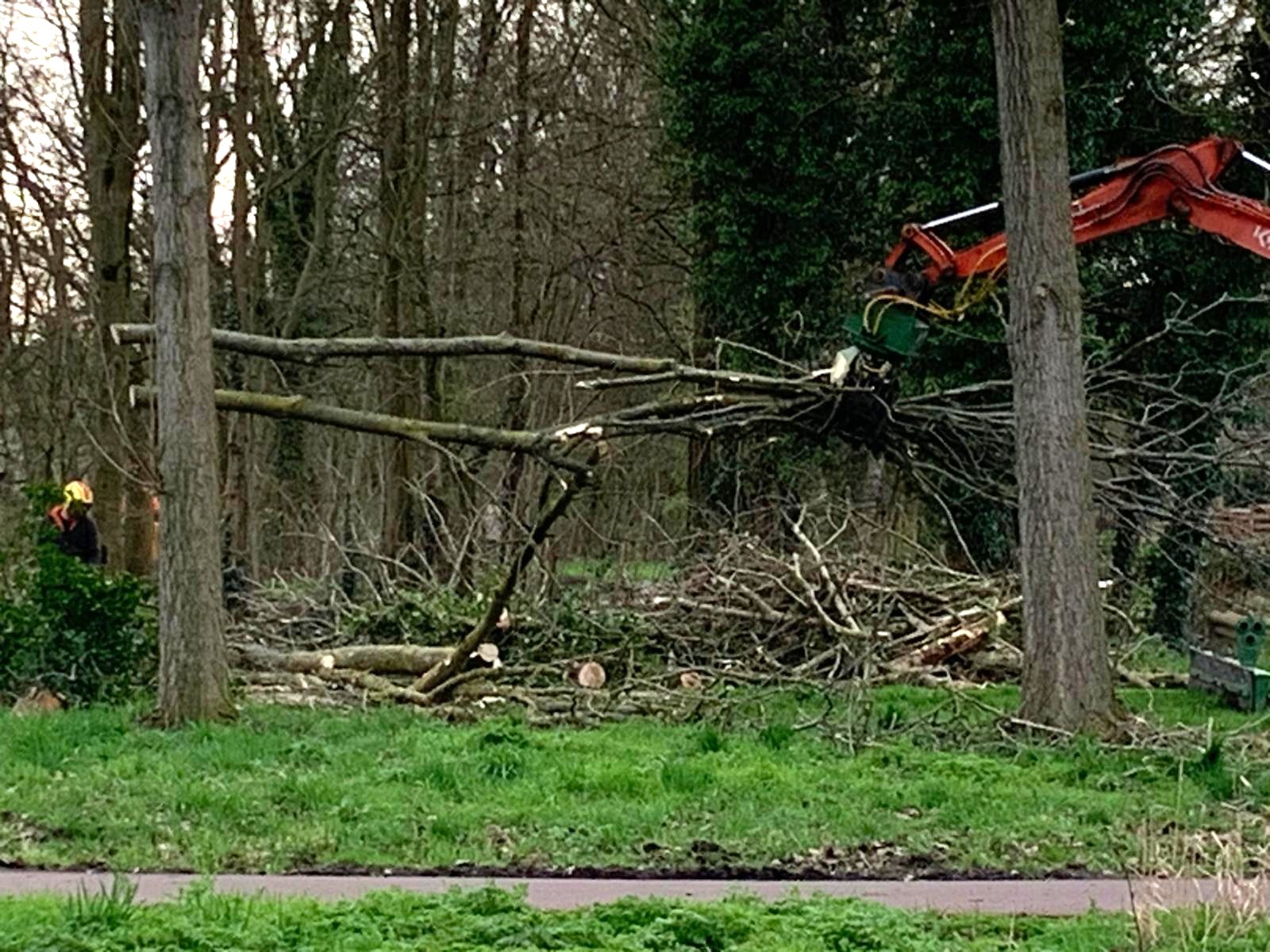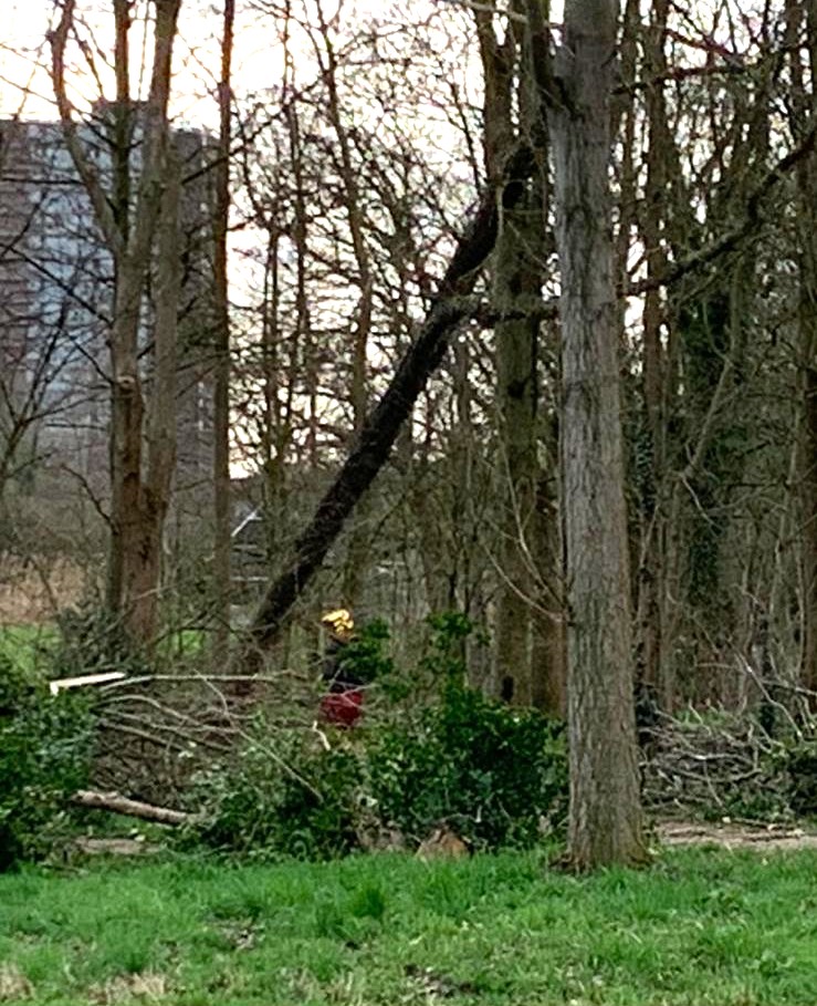 In het bosperceel van Park Kethel is de afgelopen twee weken stevig ingegrepen. Bomen die eerder al waren gemarkeerd met een zogenoemde ‘blessing’ – een rode stip – zijn omgehaald en ter plekke versnipperd. Het gaat om dode bomen en exemplaren die ernstig waren aangetast door wortelrot.