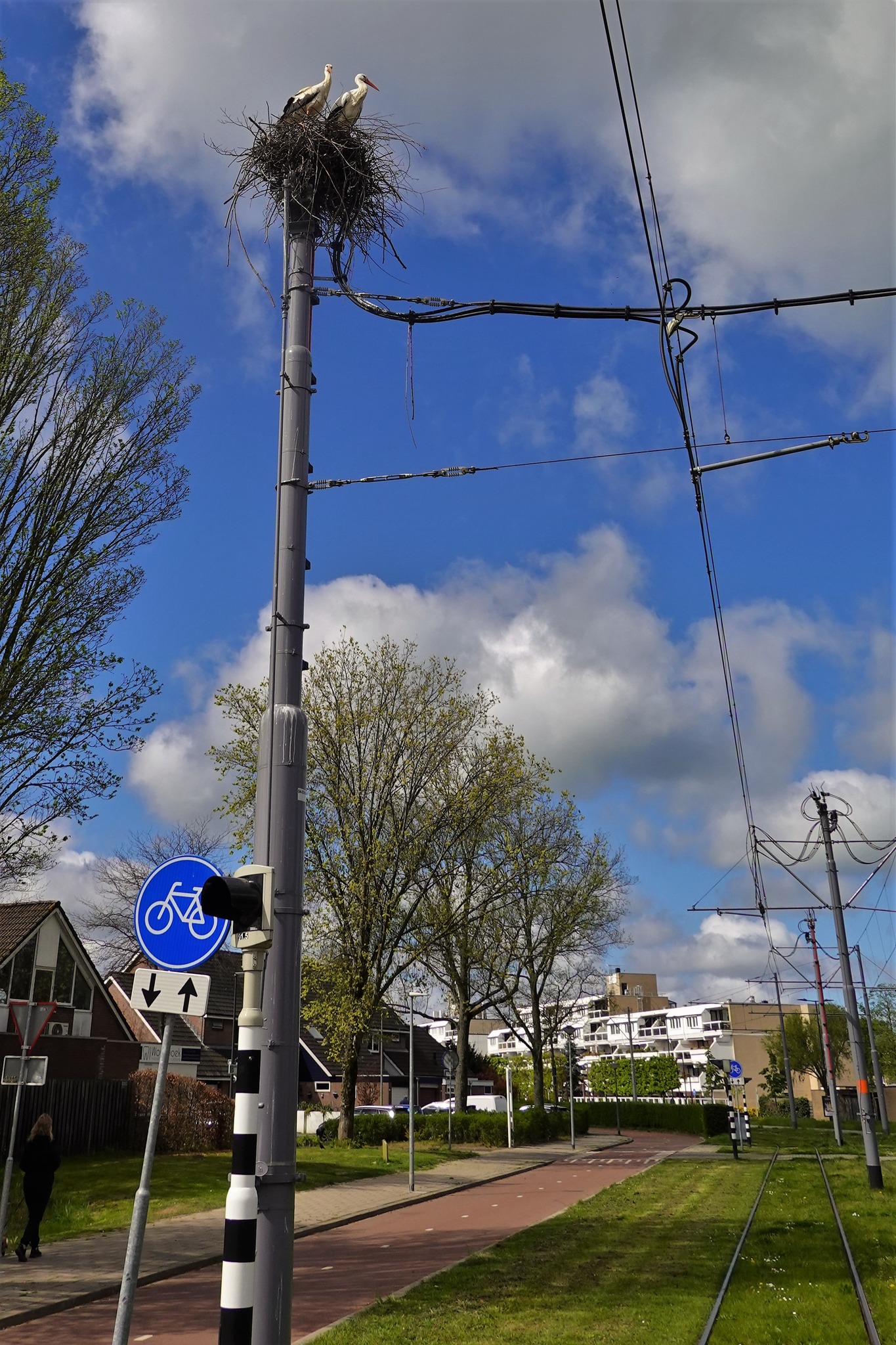 Na zorgvuldige overweging hebben de ooievaars uiteindelijk gekozen voor een vertrouwde locatie: het oude nest op de kruising van de Harreweg en de Scheepvaartweg, bovenop een paal van de tram-bovenleiding. Een plek die misschien druk is, maar duidelijk zijn charme heeft behouden.