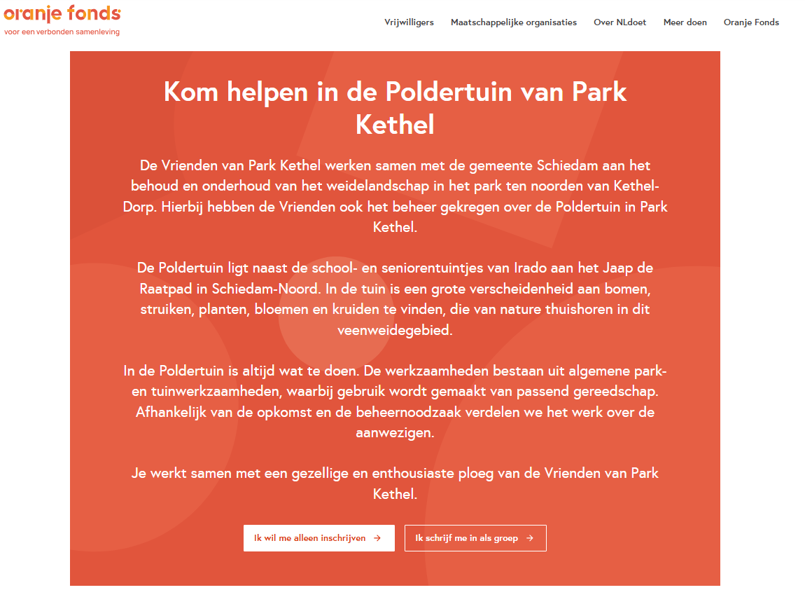 Goed nieuws voor de Vrienden van Park Kethel: Het Oranje Fonds heeft een financiële bijdrage toegekend aan de activiteit ‘Kom helpen in de Poldertuin’.